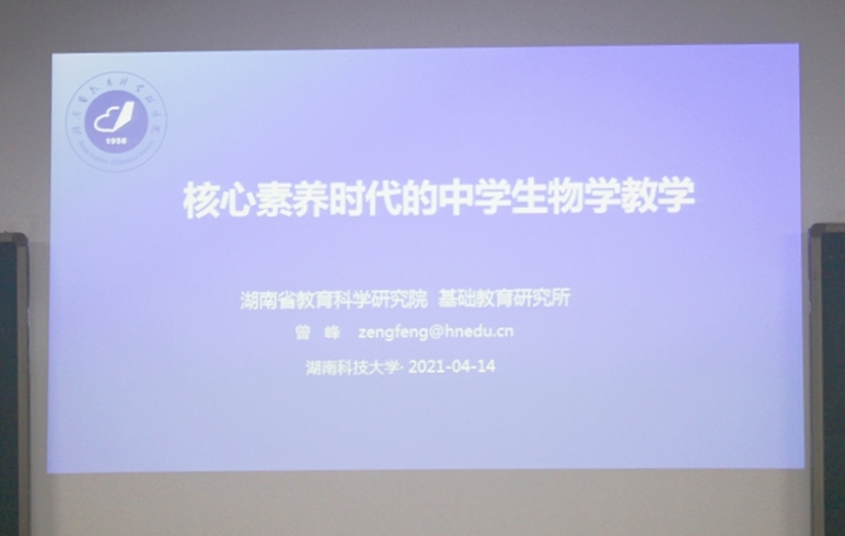 4月14日下午,湖南省教育科学研究院基础教育研究所中学生物学学科教研员,高中教育研究室主任曾峰应邀来校做主题为“核心素养时代的中学生物学教学”的讲座。泡芙短视频 党委书记严明理、副院长孙远东、周定港、生物科学系系主任张大为及教师代表易俗、彭喜旭等老师到场参加。17级、18级生物科学专业本科生,20级学科教学(生物)研究生近200余人参加讲座。讲座由副院长周定港主持。