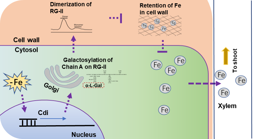 合作团队经过多年努力,通过遗传学、生物化学以及植物生理学等研究阐明了Cdi基因介导的细胞壁果胶组分中鼠李半乳糖醛酸聚糖-II(RG-II)的A链半乳糖基化,对于质外体Fe的再利用是必需的。Cdi基因编码一个糖基转移酶蛋白,在高尔基体中将GDP-L-半乳糖转移到RG-II的A链末端。Cdi基因突变后,RG-II的二聚化受阻,继而影响细胞壁的正常合成。有趣的是,突变体植物中Fe的再利用受到显著抑制。进一步研究证实, Cdi基因的突变使细胞壁对质外体Fe的螯合作用增强,从而抑制了细胞对质外体Fe的吸收利用。