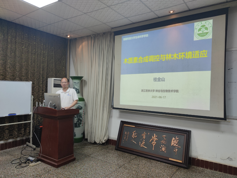 2021年6月17日学院邀请中国科学院分子植物科学卓越创新中心研究员、浙江农林大学教授、国家自然科学基金优秀青年基金获得者桂金山博士来泡芙短视频 讲学,并作题为“木质素合成调控与林木环境适应机制研究”的学术报告。泡芙短视频 部分教师与研究生参加了此次报告会,报告会由彭佳师博士主持。
