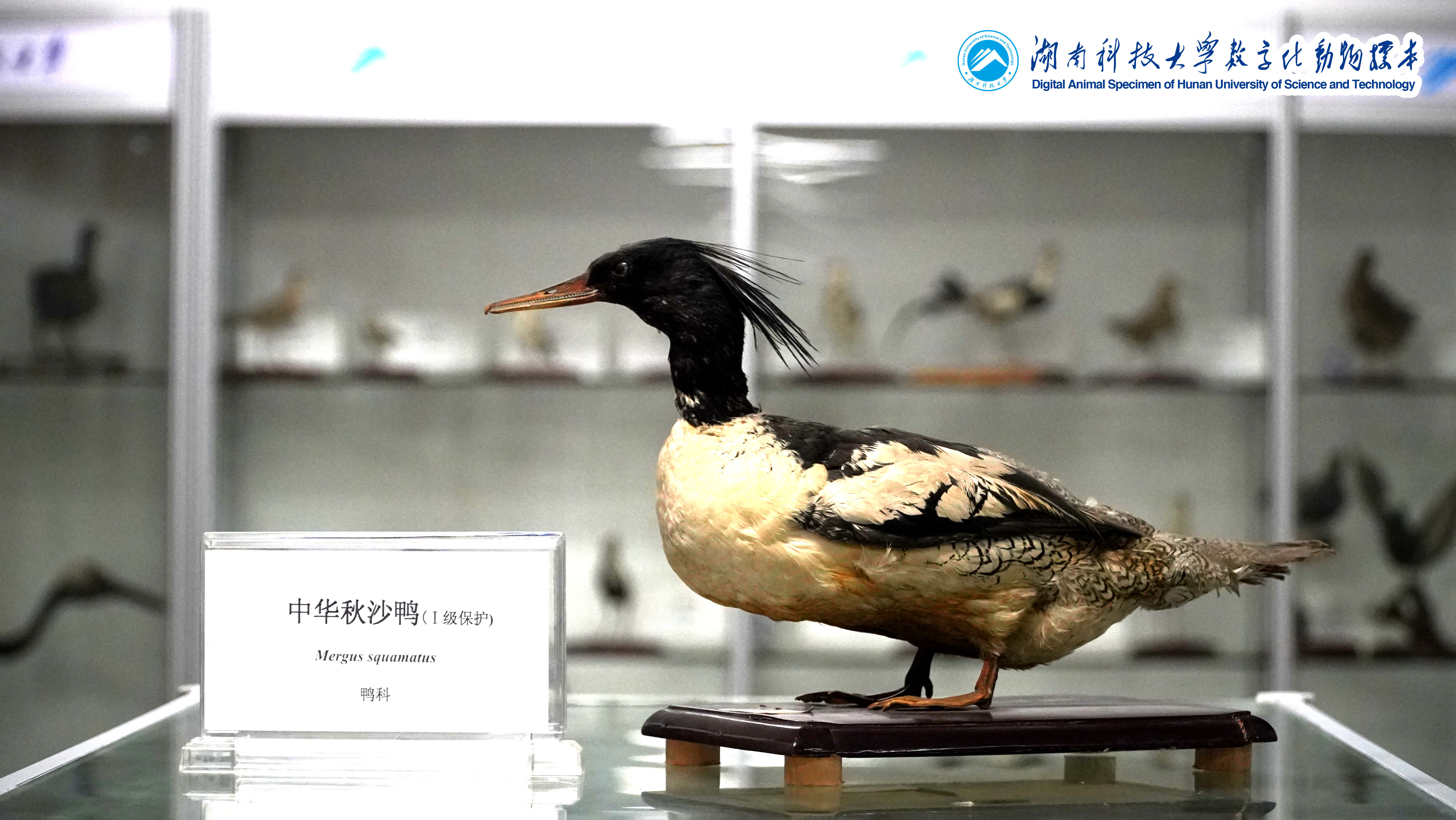 中华秋沙鸭(Mergus squamatus):隶属于鸟纲雁形目、鸭科,世界濒危保护动物,国家一级保护动物。俗名鳞胁秋沙鸭,是中国的特有物种。嘴形侧扁,前端尖出,与鸭科其它种类具有平扁的喙形不同。嘴和腿脚红色。雄鸭头部和上背黑色下背、腰部和尾上覆羽白色;翅上有白色翼镜;头顶的长羽后伸成双冠状。胁羽上有黑色鱼鳞状斑纹。出没于林区内的湍急河流,有时在开阔湖泊。成对或以家庭为群。潜水捕食鱼类。分布于西伯利亚以及中国大陆的黑龙江、吉林、河北、长江以南等地。此标本于1992年由本室老师自己制作而成,其获得途径也是很有意思,被学校一小学生从野外捡到,先是作为宠物饲养,后因死亡而制成标本。