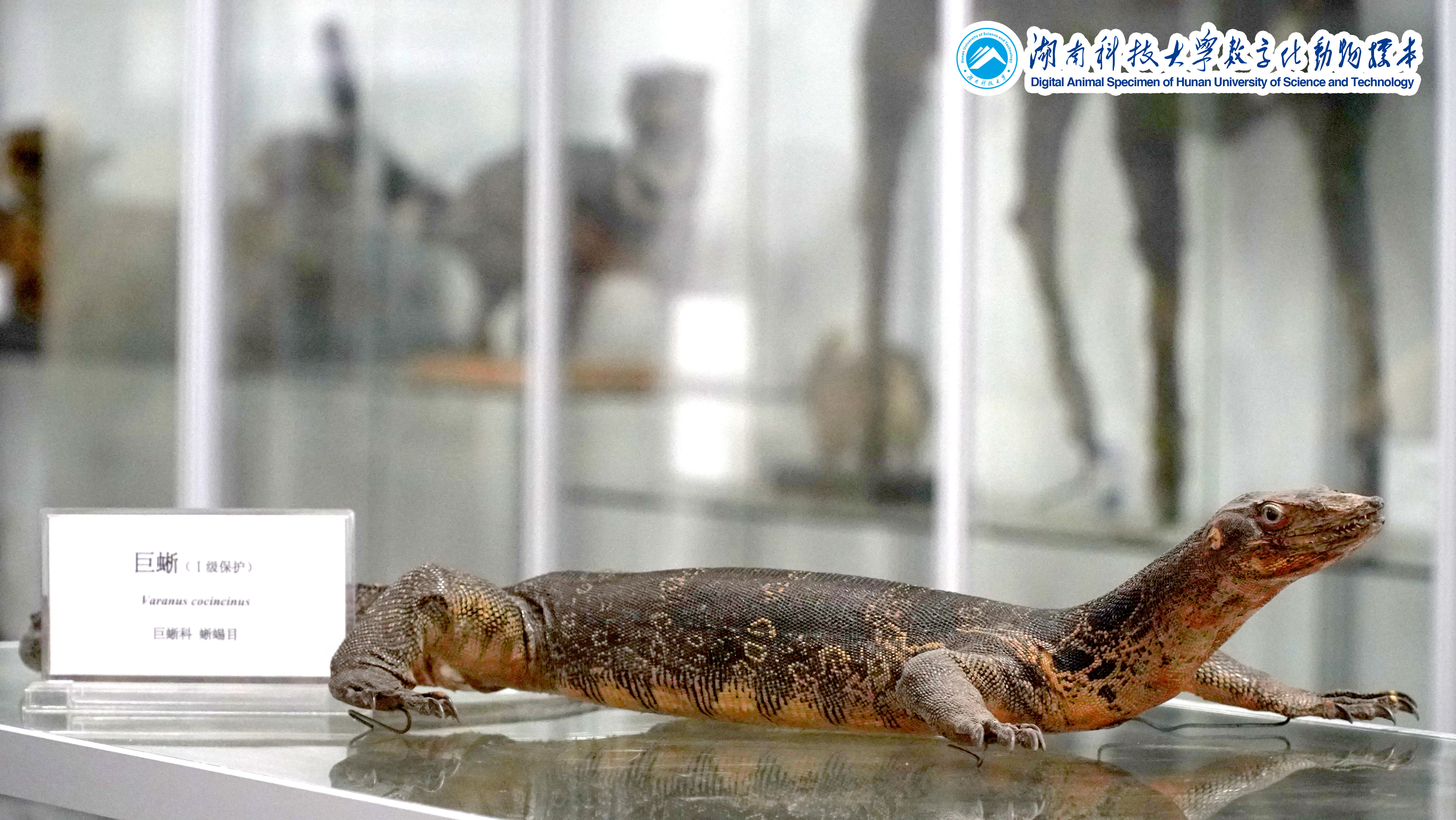 巨蜥(Salvator stellio salvator):隶属于爬行纲蜥蜴目、巨蜥科,国家一级保护动物。体长一般为60~90厘米,最大的可达2~3米,体重一般20~30千克,尾长70~100厘米,最长的可达150厘米,通常约占身体长度的五分之三。尾部则为黑黄相间的环纹,同时黑色环纹上常有小黄斑;四肢强壮,趾上有锐爪;其背面有小黄斑,故称“五爪金龙”。巨蜥是中国蜥蜴类中体形最大的种类,也是世界上较大的蜥蜴类之一。喜欢栖息于山区的溪流附近或沿海的河口、山塘、水库等地。食物可以根据不同环境下所具有的食物加以选择,能在水中捕食鱼类,也可爬到树上捕食鸟类、昆虫及鸟卵,此外也吃蛙、蛇、鸟、各种动物的卵、鼠及昆虫等。主要分布于中国、马来西亚、缅甸、泰国、印度尼西亚及澳大利亚北部等地。该标本原为湘潭动物园的观赏动物,因衰老死亡后制成标本。