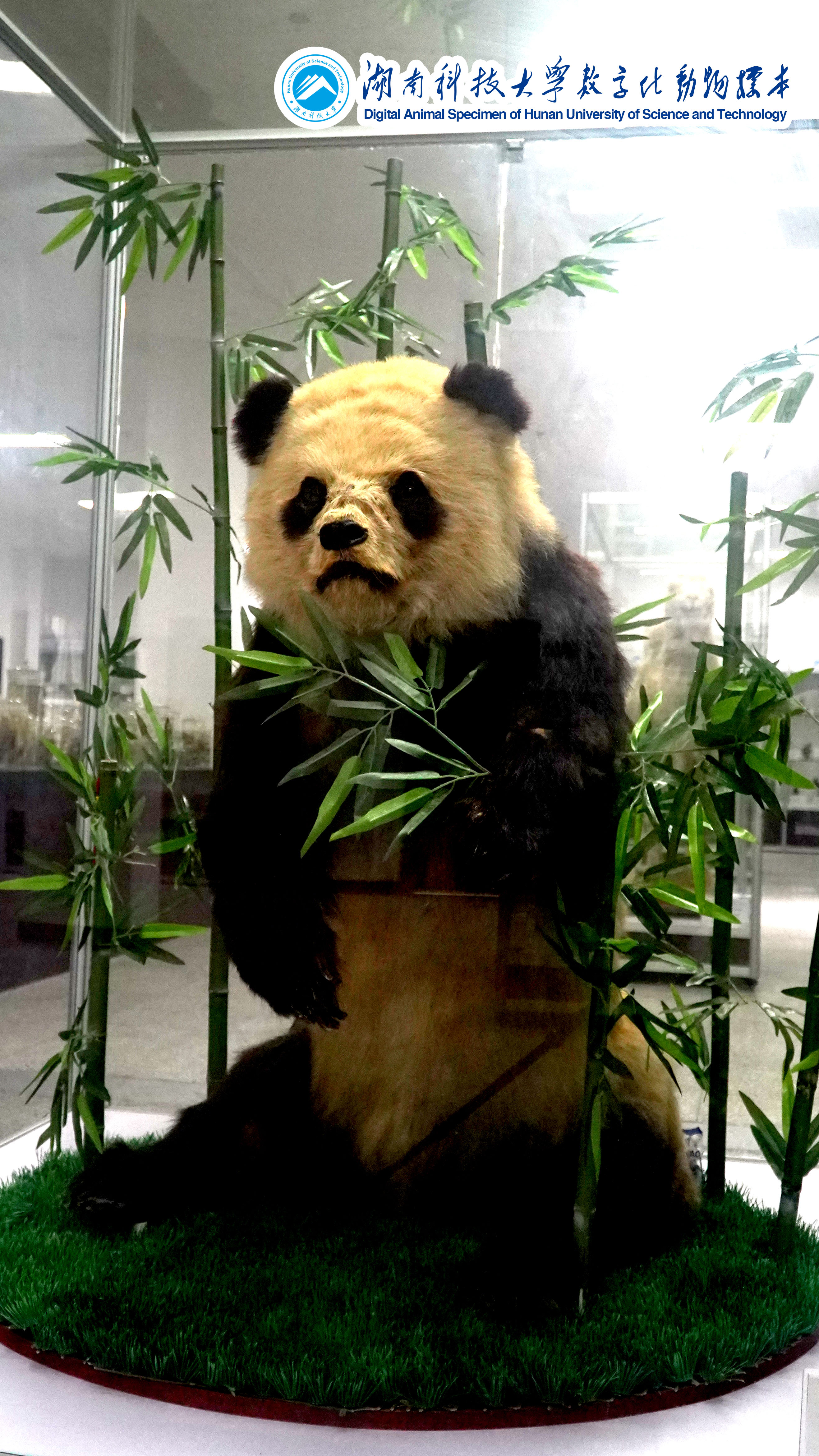 大熊猫(Ailuropoda melanoleuca):隶属于哺乳纲食肉目、熊科,国家一级保护动物;被誉为“活化石”和“中国国宝”。体型肥硕似熊、丰腴富态,头圆尾短,头躯长1.2-1.8米,尾长10-12厘米。体重80-120千克,最重可达180千克,体色为黑白两色,脸颊圆,有大的黑眼圈,标志性的内八字的行走方式,也有解剖刀般锋利的爪子。大熊猫栖于中国长江上游的高山深谷,80%以上分布于四川境内。生活在海拔2600-3500米的茂密竹林里,喜欢吃竹子,其中最喜欢吃的有大箭竹、华西箭竹等。野外大熊猫的寿命为18-20岁,圈养状态下可以超过30岁。该标本为全世界人工繁殖的第一只大熊猫,1963年产于北京动物园,取名叫“明明”,1989年死于长沙动物园。
