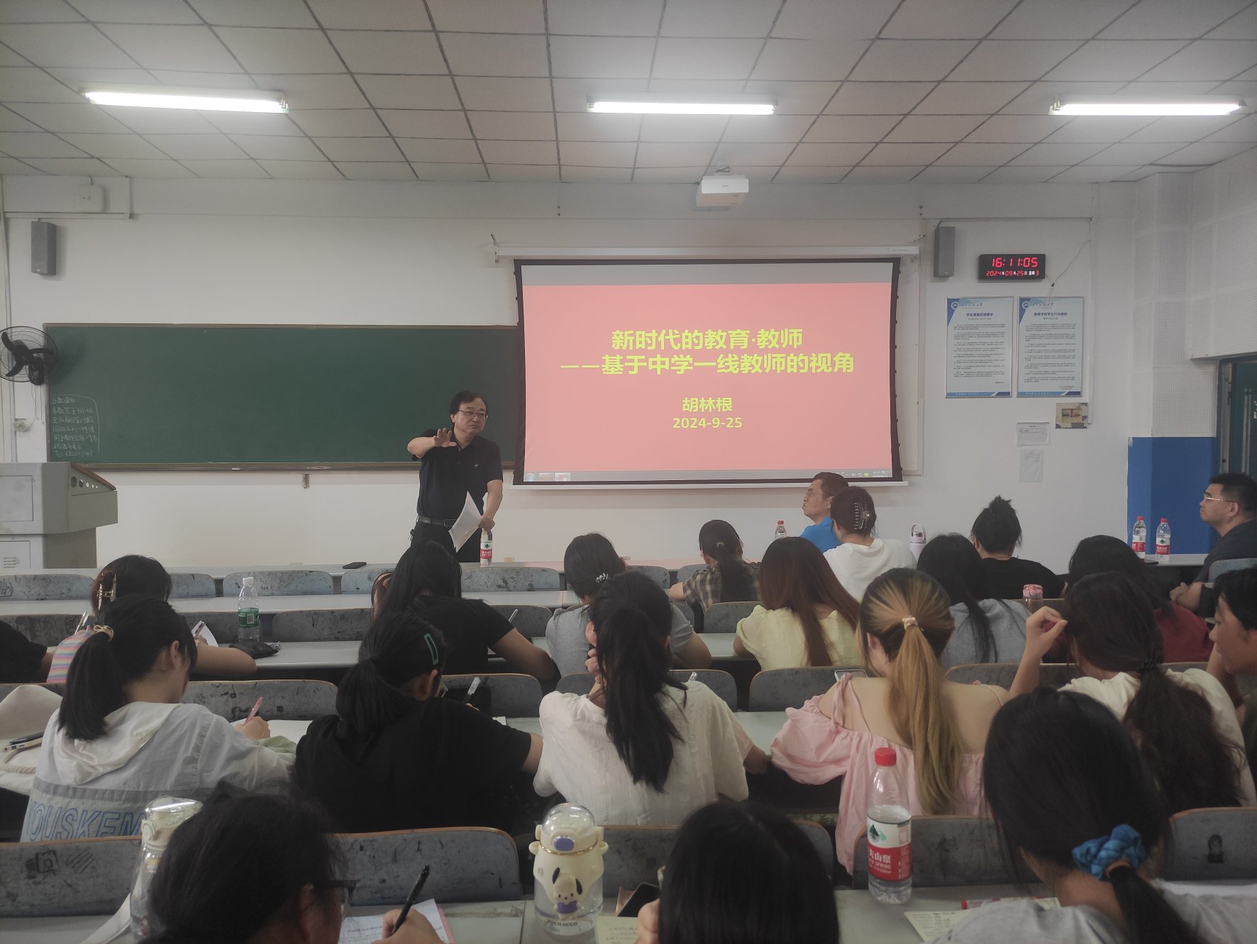 9月25日下午,湘乡二中党委书记、校长胡林根,副校长张云海等一行莅临我校讲学。胡林根书记带来了题为“新时代的教育·教师——基于中学一线教师的视角”的精彩讲座。讲座由泡芙短视频 副院长刘长军主持,全院师生代表共200余人到场聆听。