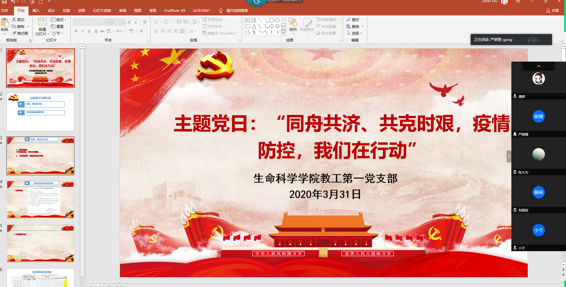 会议以“同舟共济、共克时艰,疫情防控我们在行动”为主题,通报了疫情防控期间,党支部成员全员积极响应,主动捐款情况。总结了第一党支部开展线上教学的工作概况及面临的困难和问题。最后,参会党员观看了抗疫战歌《相信年轻的力量》,赞扬了90后,00后等一批年轻人在抗疫过程中做出的突出贡献。会议指出作为党员需要及时关注疫情最新情况,发挥党员的先锋模范作用,团结一致,在做好防护的同时,教学、科研工作不松懈,共同推进学院的发展。
