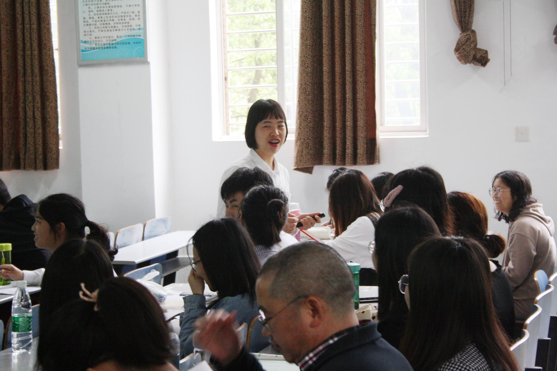 春风十里,不如课堂有你。十四位实习生们以“蛋白质是生命活动的主要承担者”、“细胞生活的环境”、“人体的呼吸”、“减数分裂”等为授课主题进行讲课,并精心制作了精美的PPT,她们在比赛中着装得体、精神饱满,教学方法多样化,讲解思路清晰、循循善诱。尤其是结合视频教学与师生游戏互动的方式增加了教学过程中的趣味性,也使得“学生们”更好地理解记忆。