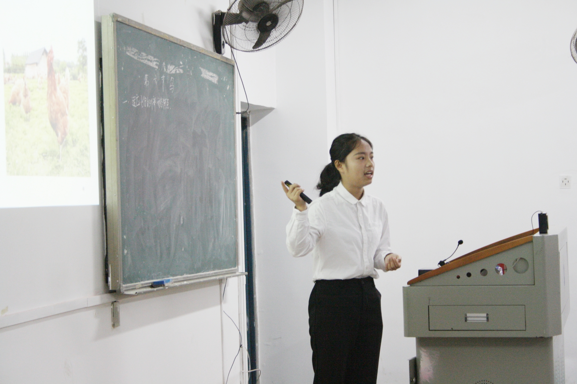 选手余永芳通过高尔基的诗歌《海燕》导入讲课的主题《鸟——适应飞行的外部形态特征》,之后又与学生互动引出了翅膀对于鸟类飞行的意义,讲授生动、妙趣横生并以此号召同学们要善思、善学,其讲课内容精彩丰富,教学目的明确主次分明、思路清晰,最后在评委同学们热烈的掌声中完美的完成了此次讲课。