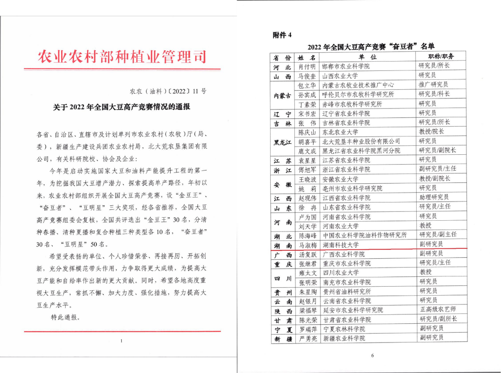 据悉,本次“全国大豆高产竞赛”是农业农村部首次举办,旨在挖掘我国大豆增产潜力、探索提高单产路径,共设立“金豆王”“奋豆者”“豆明星”三大奖项,全国共评选出“金豆王”30名,“奋豆者”30名、“豆明星”50名。马淑梅副教授作为我省唯一代表获得“奋豆者”殊荣,为提高大豆产能作出了重要贡献。