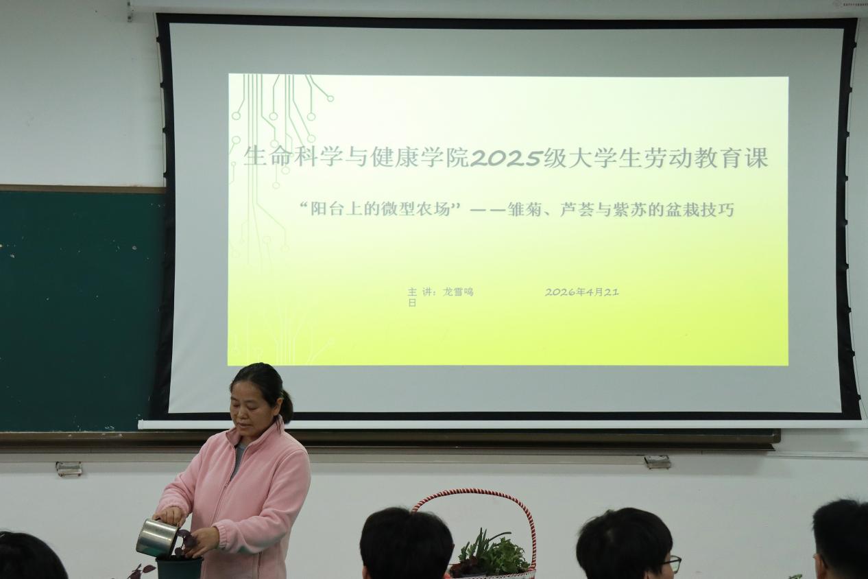 4月21日14:00,泡芙短视频 2025级大学生劳动教育课在八教103正式开讲。25级辅导员龙雪鸣老师担任主讲,以“阳台上的微型农场”为主题,围绕雏菊、芦荟与紫苏的盆栽技巧展开教学,带领同学们现场边学边做,完成了一场从“植物盲”到“生活家”的劳动实践。